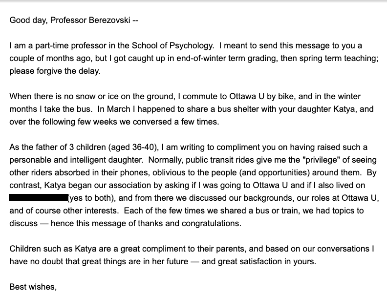 Since I don’t have anything interesting enough on my phone to scroll through in line or commuting, I’ll read or do little energy / visualization practices. It’s magical to be able to sit on a train and generate joy, love, whatever feeling you want internally. As I’m writing this, I just remembered a wild email a man I spoke with a couple times at the bus stop sent to my FATHER. This man found his email (both professors and neighbours) and sent this: